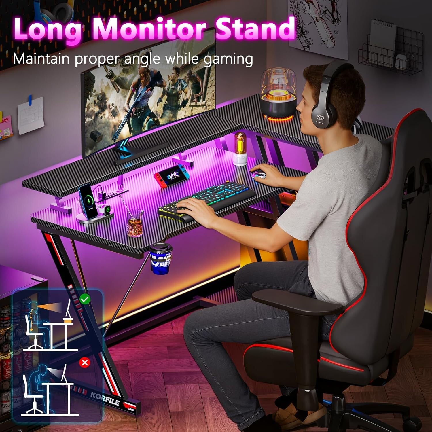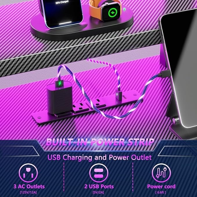 47 Inch Gaming Desk with Power Outlet & LED Lights
