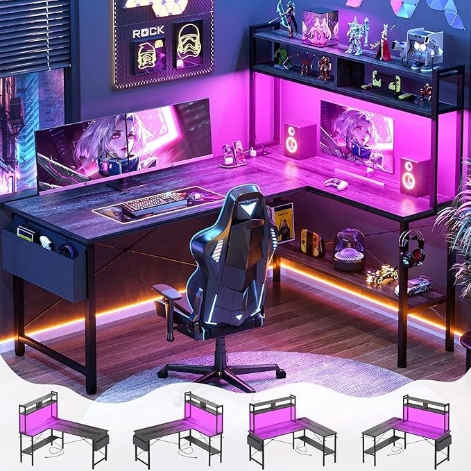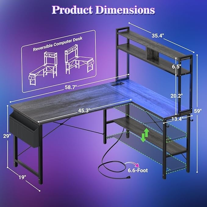 59" L Shaped Computer Desk with LED Light & Power Outlet, Reversible Home Office Desk Gamer Desks with Shelves & Storage Bag & Hooks, Corner PC Desk, Black Oak